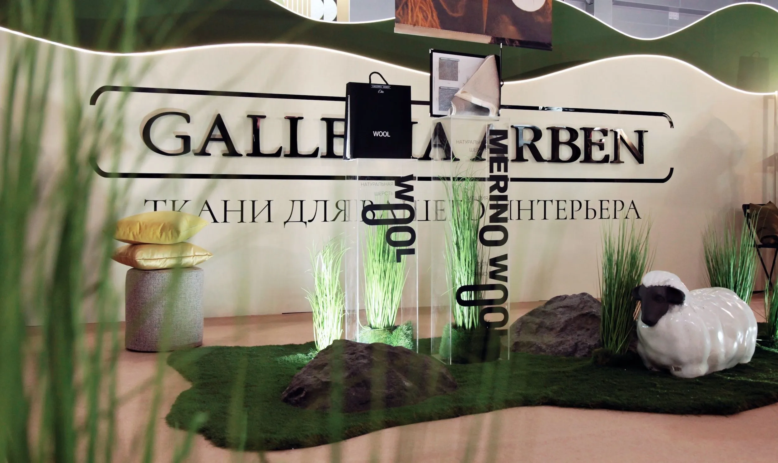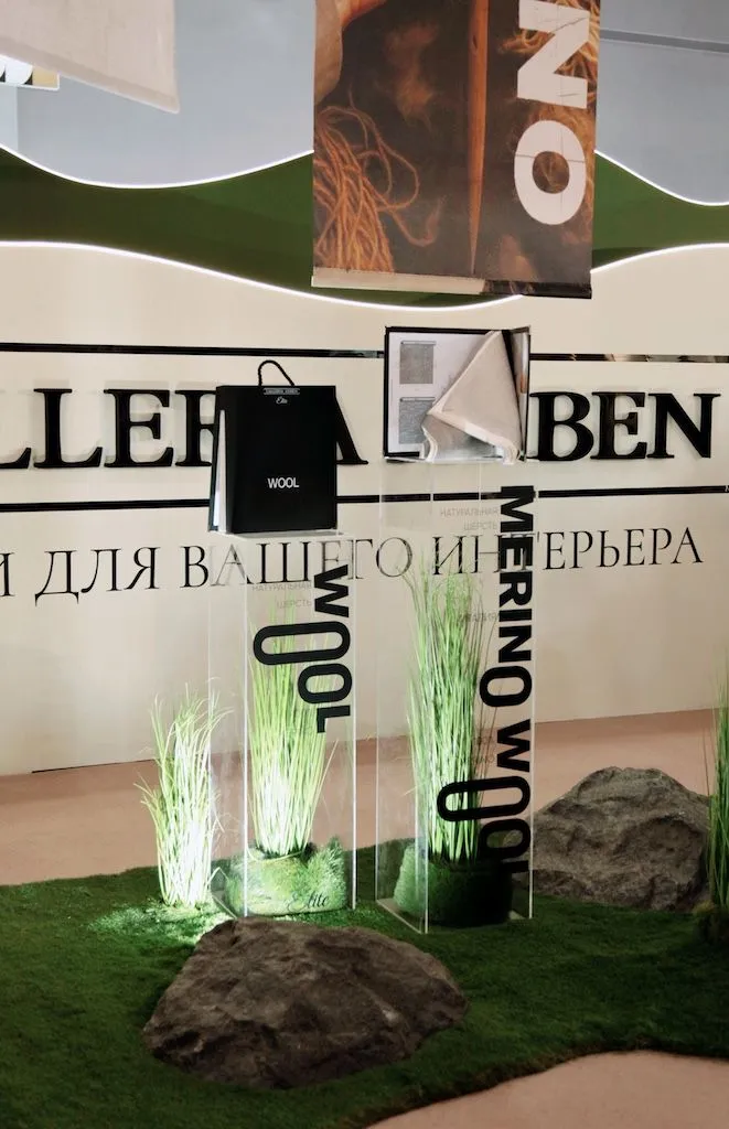 Мы посвятили стенд нашей новой коллекции тканей из натуральной шерсти мериноса - Wool. Мягкие овцы, солнечные холмы, трава и камни - мы постарались создать атмосферу австралийских горных регионов на фоне которых, натуральная шерсть смотрится наиболее органично и естественно.